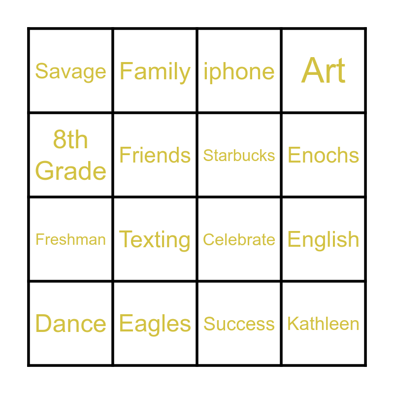 This bingo card has 24 words: Chloe, Grad, Enochs, Party, 8th Grade, Savage, Friends, Family, Eagles, Happy, Freshman, Celebrate, Dipolma, High School, Starbucks, Shadow, Success, iphone, Texting, English, Dance, Kathleen, Art and Youth Center.