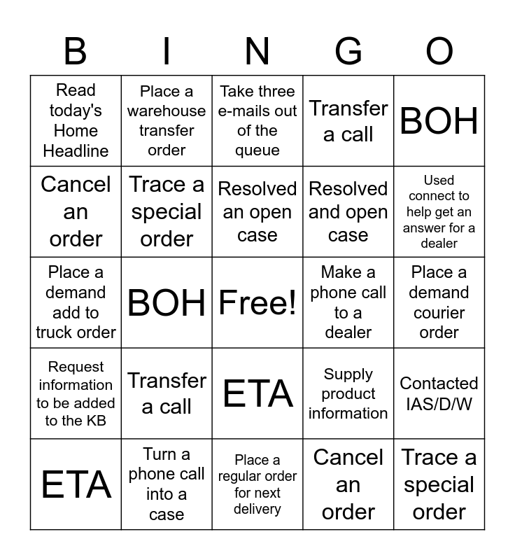 This bingo card has a free space and 24 words: ETA, Transfer a call, Resolved an open case, Cancel an order, BOH, Read today's Home Headline, Place a warehouse transfer order, Take three e-mails out of the queue, Make a phone call to a dealer, Place a demand courier order, Place a demand add to truck order, Trace a special order, Supply product information, Contacted IAS/D/W, Cancel an order, Turn a phone call into a case, Place a regular order for next delivery, Transfer a call, Used connect to help get an answer for a dealer, Request information to be added to the KB, BOH, ETA, Resolved and open case and Trace a special order.