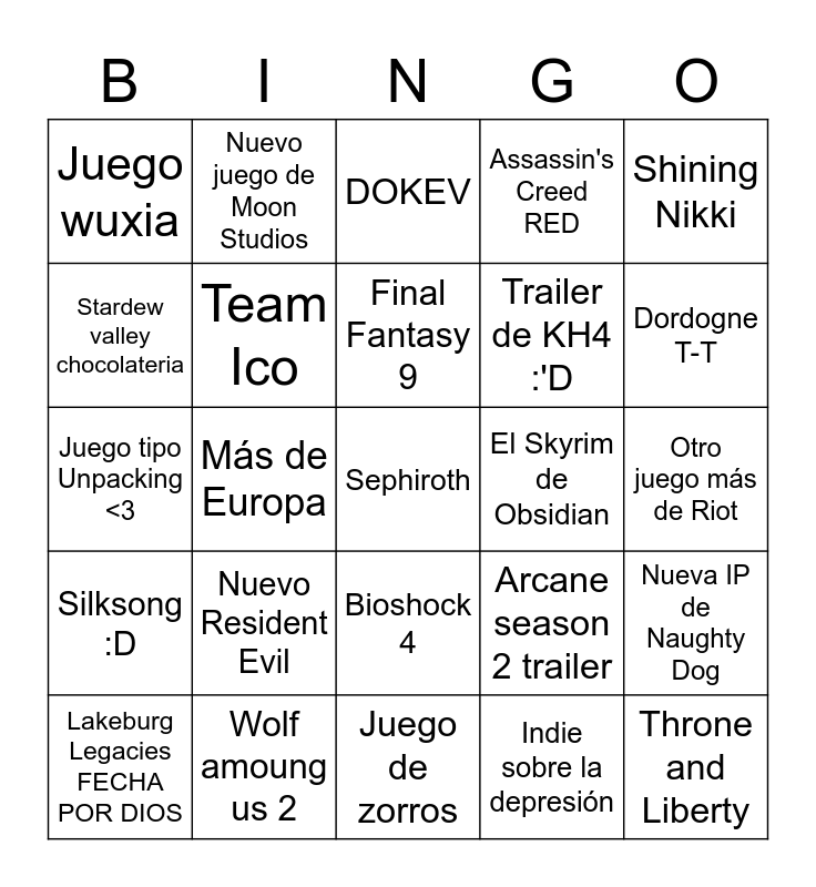 This bingo card has 25 words: Silksong :D, Wolf amoung us 2, Sephiroth, Indie sobre la depresión, Shining Nikki, Juego wuxia, Nuevo juego de Moon Studios, DOKEV, El Skyrim de Obsidian, Nueva IP de Naughty Dog, Stardew valley chocolateria, Team Ico, Juego de zorros, Arcane season 2 trailer, Dordogne T-T, Lakeburg Legacies FECHA POR DIOS, Más de Europa, Final Fantasy 9, Trailer de KH4 :'D, Otro juego más de Riot, Juego tipo Unpacking <3, Nuevo Resident Evil, Bioshock 4, Assassin's Creed RED and Throne and Liberty.