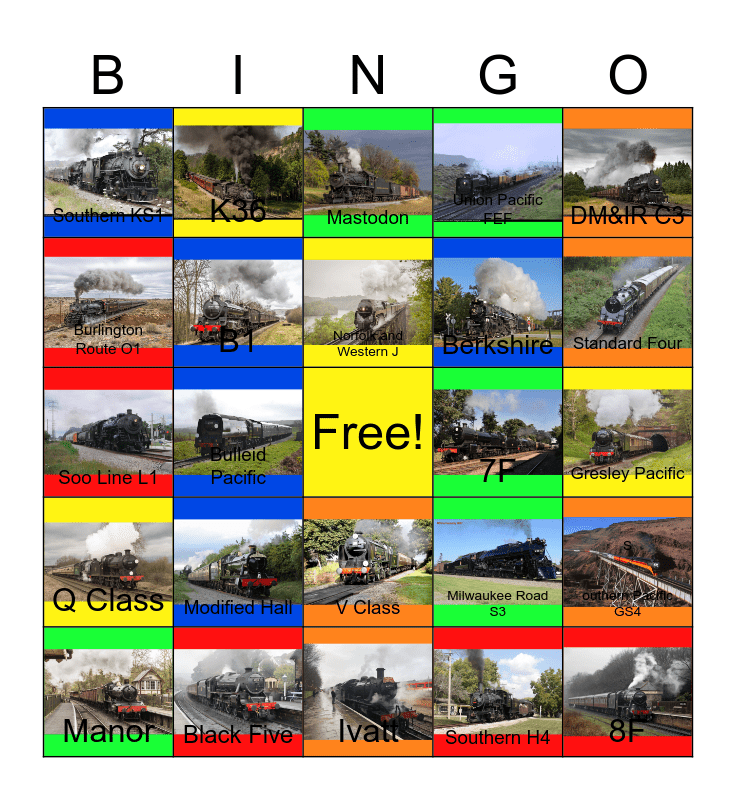 This bingo card has 24 images, a free space and 24 words: Modified Hall, Black Five, Norfolk and Western J, Manor, DM&IR C3, Southern KS1, Burlington Route O1, K36, 7F, V Class, Berkshire, Soo Line L1, Milwaukee Road S3, S outhern Pacific GS4, B1, Southern H4, Gresley Pacific, Mastodon, Standard Four, Bulleid Pacific, 8F, Q Class, Union Pacific FEF and Ivatt.