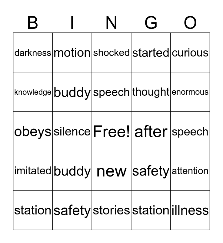 This bingo card has a free space and 24 words: buddy, safety, speech, station, curious, darkness, knowledge, motion, after, new, thought, obeys, safety, attention, buddy, station, speech, shocked, enormous, silence, illness, imitated, started and stories.
