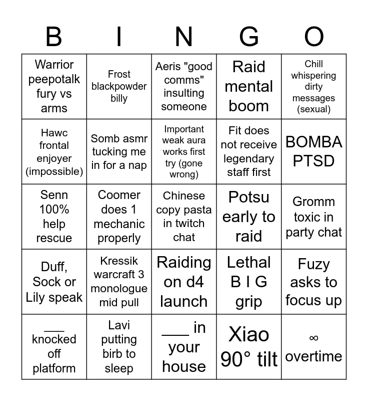 This bingo card has a free space and 24 words: Kressik warcraft 3 monologue mid pull, Lavi putting birb to sleep, Important weak aura works first try (gone wrong), ___ knocked off platform, Chill whispering dirty messages (sexual), Warrior peepotalk fury vs arms, Hawc frontal enjoyer (impossible), Frost blackpowder billy, Potsu early to raid, Raiding on d4 launch, Fit does not receive legendary staff first, Senn 100% help rescue, Lethal B I G grip, Fuzy asks to focus up, Somb asmr tucking me in for a nap, Xiao 90° tilt, Gromm toxic in party chat, Aeris "good comms" insulting someone, BOMBA PTSD, Coomer does 1 mechanic properly, ∞ overtime, Duff, Sock or Lily speak, Raid mental boom and ___ in your house.