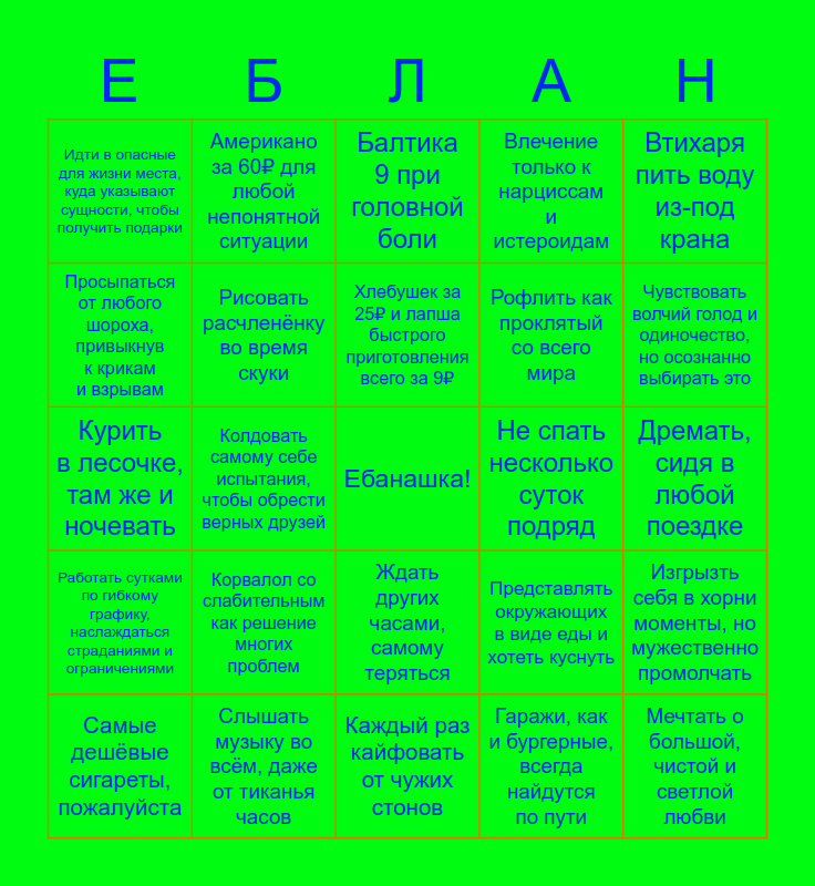 This bingo card has a free space and 24 words: Самые дешёвые сигареты, пожалуйста, Корвалол со слабительным как решение многих проблем, Хлебушек за 25₽ и лапша быстрого приготовления всего за 9₽, Гаражи, как и бургерные, всегда найдутся по пути, Втихаря пить воду из-под крана, Идти в опасные для жизни места, куда указывают сущности, чтобы получить подарки, Американо за 60₽ для любой непонятной ситуации, Балтика 9 при головной боли, Не спать несколько суток подряд, Дремать, сидя в любой поездке, Курить в лесочке, там же и ночевать, Рисовать расчленёнку во время скуки, Представлять окружающих в виде еды и хотеть куснуть, Изгрызть себя в хорни моменты, но мужественно промолчать, Просыпаться от любого шороха, привыкнув к крикам и взрывам, Слышать музыку во всём, даже от тиканья часов, Каждый раз кайфовать от чужих стонов, Влечение только к нарциссам и истероидам, Чувствовать волчий голод и одиночество, но осознанно выбирать это, Работать сутками по гибкому графику, наслаждаться страданиями и ограничениями, Колдовать самому себе испытания, чтобы обрести верных друзей, Ждать других часами, самому теряться, Рофлить как проклятый со всего мира and Мечтать о большой, чистой и светлой любви.