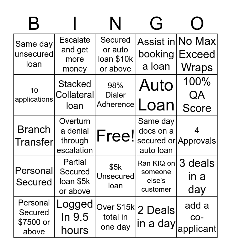 This bingo card has a free space and 24 words: Partial Secured loan $5k or above, Logged In 9.5 hours, 98% Dialer Adherence, Personal Secured $7500 or above, No Max Exceed Wraps, Same day unsecured loan, 10 applications, Escalate and get more money, Same day docs on a secured or auto loan, $5k Unsecured loan, Auto Loan, Branch Transfer, Ran KIQ on someone else's customer, 3 deals in a day, Stacked Collateral loan, 2 Deals in a day, 4 Approvals, Secured or auto loan $10k or above, 100% QA Score, Overturn a denial through escalation, add a co-applicant, Personal Secured, Assist in booking a loan and Over $15k total in one day.