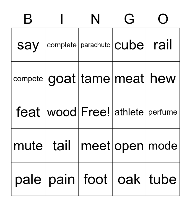 This bingo card has a free space and 24 words: tail, pain, tame, pale, rail, say, compete, complete, athlete, meet, meat, feat, open, mode, goat, oak, perfume, parachute, hew, wood, tube, mute, cube and foot.
