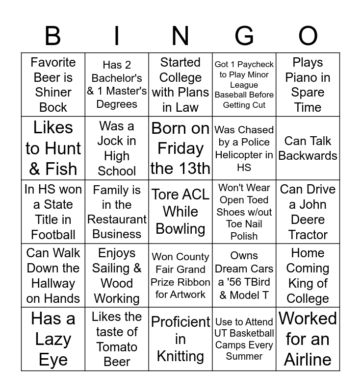 This bingo card has 25 words: Enjoys Sailing & Wood Working, Proficient in Knitting, Born on Friday the 13th, Has a Lazy Eye, Plays Piano in Spare Time, Favorite Beer is Shiner Bock, Likes to Hunt & Fish, Has 2 Bachelor's & 1 Master's Degrees, Won't Wear Open Toed Shoes w/out Toe Nail Polish, Won County Fair Grand Prize Ribbon for Artwork, Was Chased by a Police Helicopter in HS, In HS won a State Title in Football, Owns Dream Cars a '56 TBird & Model T, Home Coming King of College, Was a Jock in High School, Worked for an Airline, Can Drive a John Deere Tractor, Started College with Plans in Law, Can Talk Backwards, Family is in the Restaurant Business, Tore ACL While Bowling, Likes the taste of Tomato Beer, Can Walk Down the Hallway on Hands, Got 1 Paycheck to Play Minor League Baseball Before Getting Cut and Use to Attend UT Basketball Camps Every Summer.