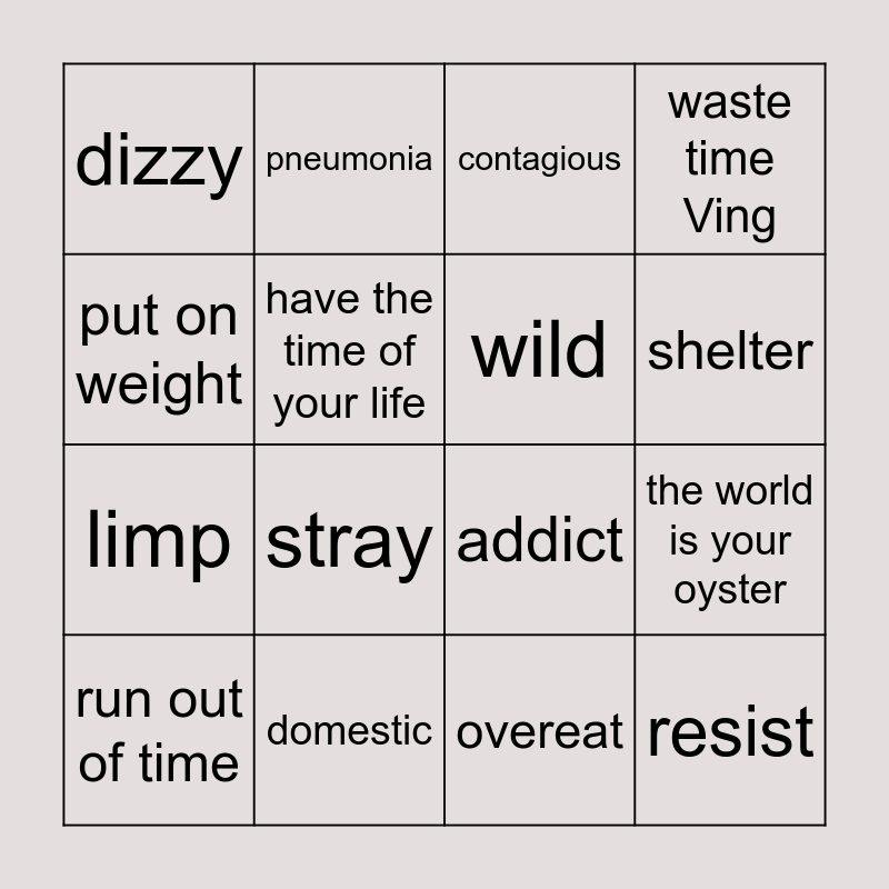 This bingo card has 16 words: domestic, the world is your oyster, contagious, dizzy, limp, pneumonia, addict, overeat, put on weight, have the time of your life, run out of time, waste time Ving, stray, shelter, wild and resist.