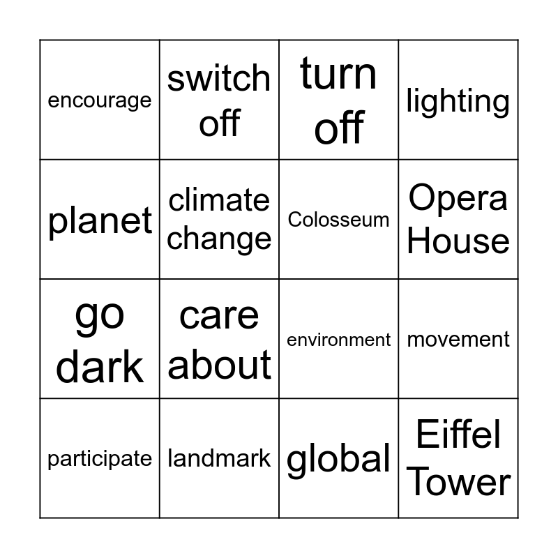 This bingo card has 16 words: landmark, movement, turn off, encourage, go dark, switch off, environment, global, planet, climate change, participate, lighting, care about, Opera House, Colosseum and Eiffel Tower.