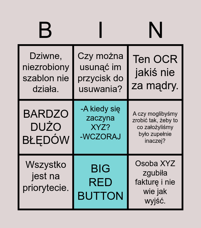 This bingo card has a free space and 10 words: BIG RED BUTTON, Ten OCR jakiś nie za mądry., Dziwne, niezrobiony szablon nie działa., Osoba XYZ zgubiła fakturę i nie wie jak wyjść., BARDZO DUŻO BŁĘDÓW, Wszystko jest na priorytecie., Czy można usunąć im przycisk do usuwania?, Jednak nie, zmieńmy to po raz 55., A czy moglibyśmy zrobić tak, żeby to co założyliśmy było zupełnie inaczej? and Bułgaria zrobiła tak, żeby testy przeszły..