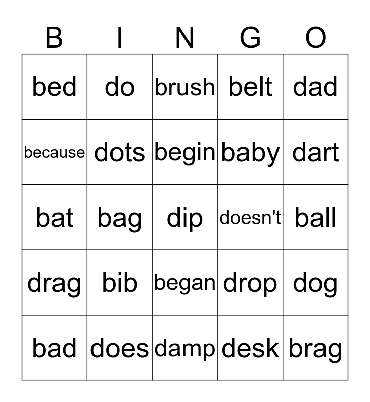 This bingo card has a free space and 24 words: bib, does, begin, bad, dad, bed, because, do, doesn't, began, baby, bat, drop, dog, dots, desk, ball, brush, dart, bag, brag, drag, belt and damp.