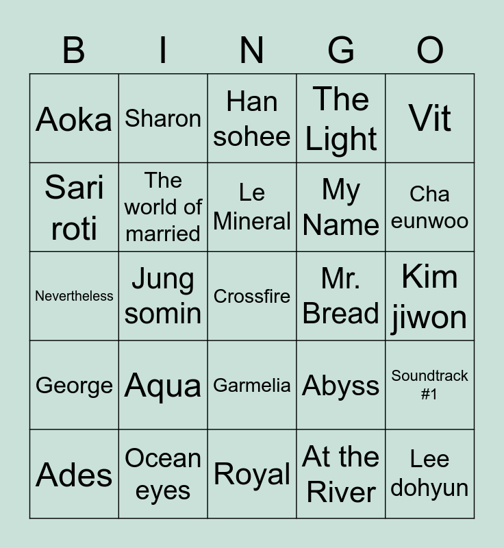 This bingo card has 25 words: Aqua, Royal, Le Mineral, Ades, Vit, Aoka, Sari roti, Sharon, Mr. Bread, Garmelia, My Name, Nevertheless, Abyss, Soundtrack #1, The world of married, Lee dohyun, Kim jiwon, Han sohee, Cha eunwoo, Jung somin, Crossfire, Ocean eyes, George, The Light and At the River.