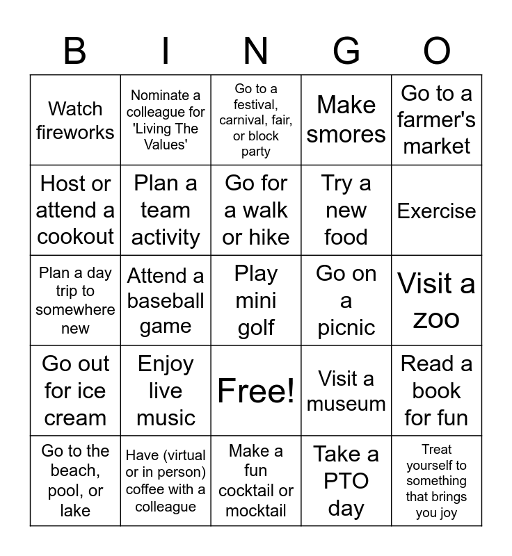 This bingo card has 26 words: Free!, Take a PTO day, Go for a walk or hike, Have (virtual or in person) coffee with a colleague, Go to a farmer's market, Watch fireworks, Host or attend a cookout, Nominate a colleague for 'Living The Values', Visit a zoo, Visit a museum, Try a new food, Plan a day trip to somewhere new, Read a book for fun, Go to the beach, pool, or lake, Attend a baseball game, Carry out a random act of kindness, Make smores, Go out for ice cream, Go to a festival, carnival, fair, or block party, Play mini golf, Exercise, Make a fun cocktail or mocktail, Go on a picnic, Enjoy live music, Plan a team activity and Treat yourself to something that brings you joy.