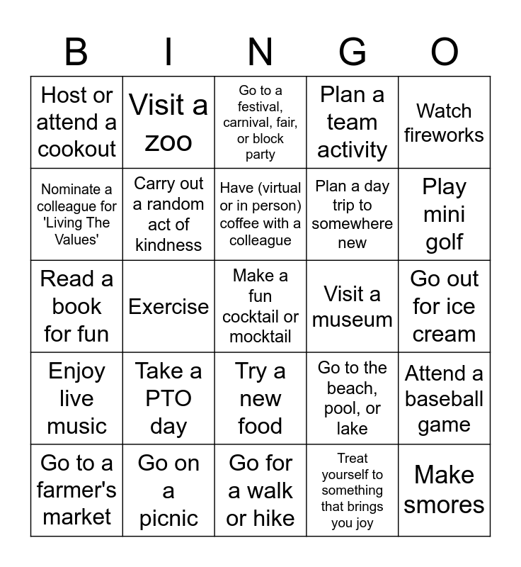 This bingo card has 25 words: Take a PTO day, Go for a walk or hike, Have (virtual or in person) coffee with a colleague, Go to a farmer's market, Watch fireworks, Host or attend a cookout, Nominate a colleague for 'Living The Values', Visit a zoo, Visit a museum, Try a new food, Plan a day trip to somewhere new, Read a book for fun, Go to the beach, pool, or lake, Attend a baseball game, Carry out a random act of kindness, Make smores, Go out for ice cream, Go to a festival, carnival, fair, or block party, Play mini golf, Exercise, Make a fun cocktail or mocktail, Go on a picnic, Enjoy live music, Plan a team activity and Treat yourself to something that brings you joy.