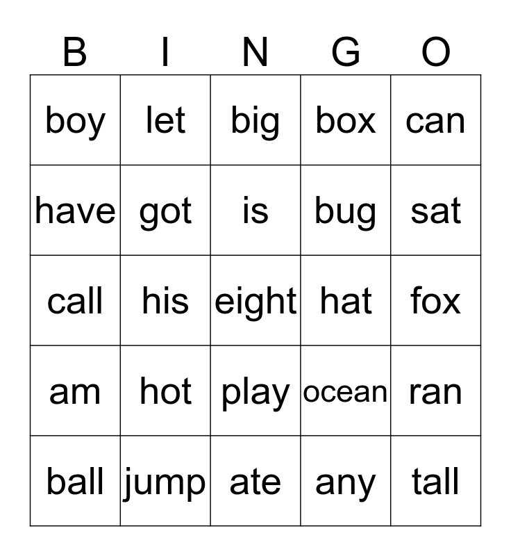 This bingo card has 25 words: hot, ate, is, ball, can, boy, have, let, hat, play, bug, call, ocean, ran, got, tall, fox, big, sat, his, eight, jump, am, box and any.