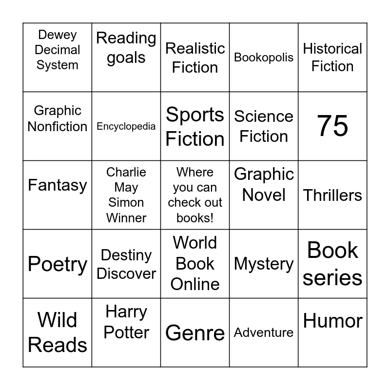 This bingo card has a free space and 24 words: Destiny Discover, Harry Potter, Sports Fiction, Wild Reads, Historical Fiction, Dewey Decimal System, Graphic Nonfiction, Reading goals, Graphic Novel, World Book Online, Science Fiction, Fantasy, Mystery, Book series, Encyclopedia, Adventure, Thrillers, Realistic Fiction, 75, Charlie May Simon Winner, Humor, Poetry, Bookopolis and Genre.