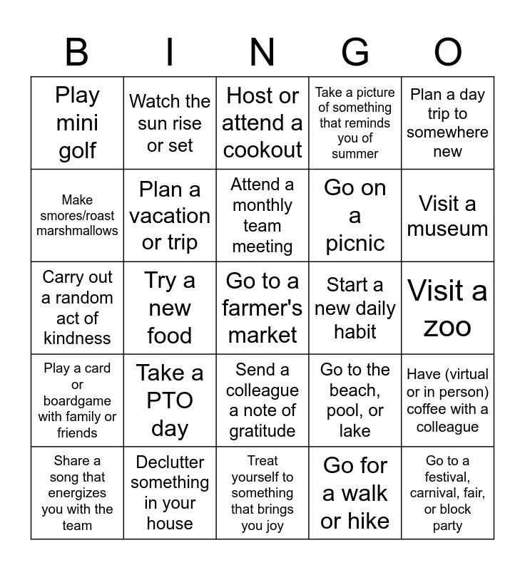 This bingo card has 42 words: Free!, Attend a monthly team meeting, Attend Total Rewards or HR outing, Take a PTO day, Go for a walk or hike, Have (virtual or in person) coffee with a colleague, Go to a farmer's market, Watch fireworks, Host or attend a cookout, Send a colleague a note of gratitude, Visit a zoo, Visit a museum, Try a new food, Plan a day trip to somewhere new, Read a book for fun, Go to the beach, pool, or lake, Attend a baseball game, Carry out a random act of kindness, Make homemade arts and crafts project, Watch the sun rise or set, Make smores/roast marshmallows, Go out for ice cream, Go to a festival, carnival, fair, or block party, Play mini golf, Exercise, Make a fun cocktail or mocktail, Go on a picnic, Dine outside, Enjoy live music, Learn a new skill or hobby, Create sidewalk art with chalk, Play a card or boardgame with family or friends, Plan a vacation or trip, Treat yourself to something that brings you joy, Randomly text someone something you like about them, Share a song that energizes you with the team, Declutter something in your house, Start a new daily habit, Learn to make something using origami, Swing on a swing set, Take a picture of something that reminds you of summer and Stargaze.