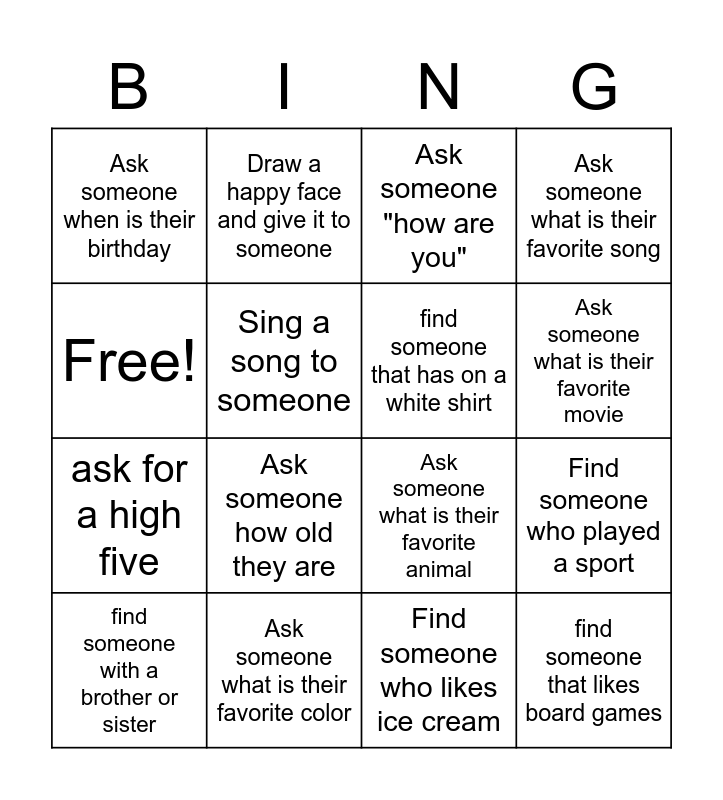 This bingo card has 16 words: Ask someone what is their favorite color, Find someone who played a sport, Ask someone "how are you", Ask someone when is their birthday, ask for a high five, Draw a happy face and give it to someone, Ask someone what is their favorite animal, Find someone who likes ice cream, Free!, Sing a song to someone, find someone with a brother or sister, Ask someone what is their favorite song, Ask someone how old they are, Ask someone what is their favorite movie, find someone that has on a white shirt and find someone that likes board games.