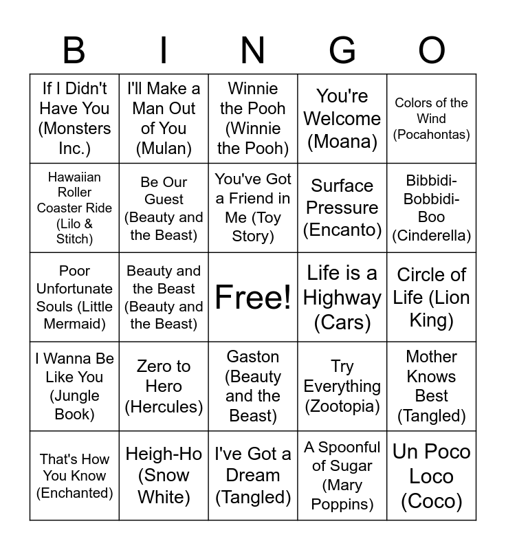 This bingo card has a free space and 52 words: How Far I'll Go (Moana), Un Poco Loco (Coco), We Don't Talk About Bruno (Encanto), I've Got a Dream (Tangled), Zero to Hero (Hercules), Part of Your World (Little Mermaid), I'll Make a Man Out of You (Mulan), I Just Can't Wait to Be Kind (Lion King), Hawaiian Roller Coaster Ride (Lilo & Stitch), Into the Unknown (Frozen 2), Be Our Guest (Beauty and the Beast), Strangers Like Me (Tarzan), Mother Knows Best (Tangled), Try Everything (Zootopia), Friend Like Me (Aladdin), The Bare Necessities (Jungle Book), You've Got a Friend in Me (Toy Story), Life is a Highway (Cars), Hakuna Matata (Lion King), Colors of the Wind (Pocahontas), Beauty and the Beast (Beauty and the Beast), A Spoonful of Sugar (Mary Poppins), If I Didn't Have You (Monsters Inc.), Surface Pressure (Encanto), Love is an Open Door (Frozen), Under the Sea (Little Mermaid), Almost There (Princess and the Frog), Touch the Sky (Brave), Bibbidi-Bobbidi-Boo (Cinderella), Zero (Wreck It Ralph), |2| (Goofy Movie), You're Welcome (Moana), Nobody Like U (Turning Red), Reflection (Mulan), Once Upon a Dream (Sleeping Beauty), Winnie the Pooh (Winnie the Pooh), Heigh-Ho (Snow White), You Can Fly! (Peter Pan), Cruella De Vil (101 Dalmatians), Duck Tales Theme (Duck Tales), Let It Go (Frozen), Circle of Life (Lion King), I Wanna Be Like You (Jungle Book), Friends on the Other Side (Princess and the Frog), Gaston (Beauty and the Beast), Oo-De-Lally (Robin Hood), Strange Things (Toy Story), Poor Unfortunate Souls (Little Mermaid), Do You Want to Build a Snowman (Frozen), I'm Late (Alice in Wonderland), That's How You Know (Enchanted) and When You Wish Upon a Star (Pinnochio).