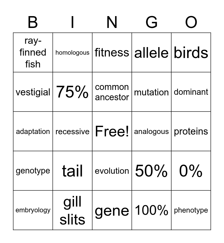 This bingo card has a free space and 24 words: tail, gill slits, common ancestor, embryology, birds, ray-finned fish, vestigial, homologous, analogous, evolution, mutation, adaptation, 50%, 0%, 75%, 100%, proteins, fitness, dominant, recessive, phenotype, genotype, allele and gene.