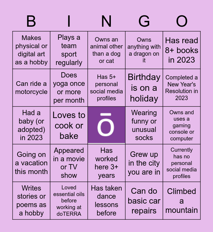 This bingo card has a free space and 29 words: Writes stories or poems as a hobby, Sings or plays an instrument, Loves to cook or bake, Has been to 3 continents, Makes physical or digital art as a hobby, Owns an animal other than a dog or cat, Does yoga once or more per month, Appeared in a movie or TV show, Wearing funny or unusual socks, Loved essential oils before working at doTERRA, Owns and uses a gaming console or computer, Climbed a mountain, Has taken dance lessons before, Can do basic car repairs, Completed a New Year's Resolution in 2023, Ran in a marathon or bike race, Has worked here 3+ years, Going on a vacation this month, Has read 8+ books in 2023, Had a baby (or adopted) in 2023, Grew up in the city you are in, Loves gardening and has one now, Birthday is on a holiday, Can ride a motorcycle, Owns anything with a dragon on it, Plays a team sport regularly, Currently has no personal social media profiles, Has 5+ personal social media profiles and Has ever followed a vegetarian diet for 3+ months.