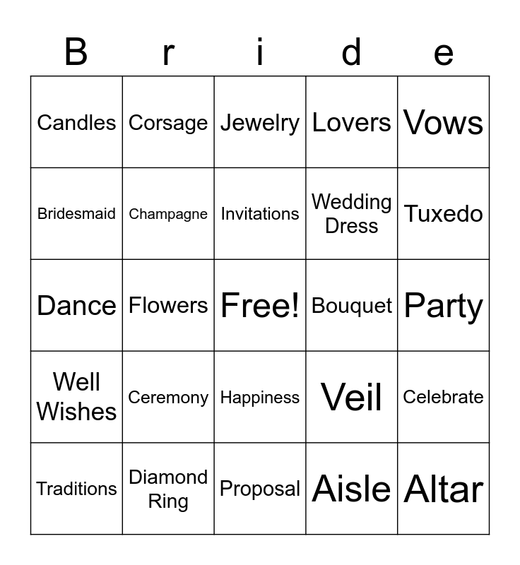 This bingo card has a free space and 29 words: Matrimony, Diamond Ring, Jewelry, Toast, Vows, Candles, Champagne, Invitations, Bouquet, Celebrate, Traditions, Flowers, Aisle, Altar, Dance, Groomsmen, Proposal, Veil, Tuxedo, Well Wishes, Ceremony, Kiss, Wedding Dress, Party, Bridesmaid, Corsage, Happiness, Lovers and Forever.