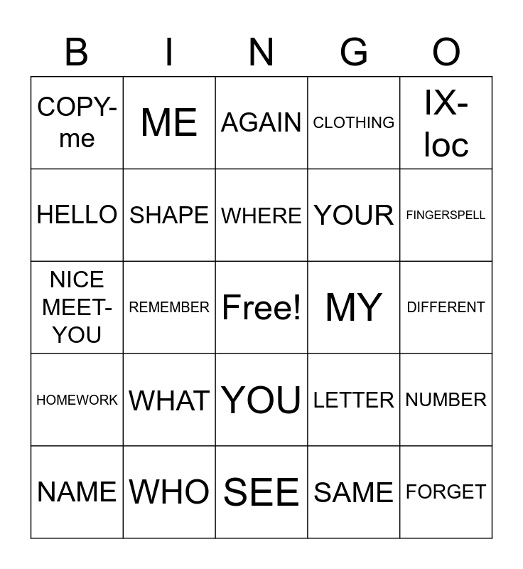 This bingo card has a free space and 24 words: WHAT, WHO, WHERE, NAME, IX-loc, COPY-me, HELLO, ME, MY, YOU, YOUR, NICE MEET-YOU, LETTER, NUMBER, SHAPE, SAME, DIFFERENT, AGAIN, FINGERSPELL, REMEMBER, FORGET, HOMEWORK, CLOTHING and SEE.