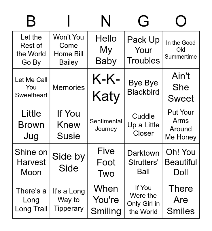 This bingo card has a free space and 30 words: It's a Long Way to Tipperary, 4 Leaf Clover, If You Knew Susie, Have You Ever Been Lonely, Let the Rest of the World Go By, Hello My Baby, Memories, Five Foot Two, Cuddle Up a Little Closer, When You're Smiling, Put Your Arms Around Me Honey, There Are Smiles, If You Were the Only Girl in the World, For Me and My Gal of Loveland, Ain't She Sweet, Red Red Robin, Darktown Strutters' Ball, Shine on Harvest Moon, Side by Side, In the Good Old Summertime, Little Brown Jug, Heart of My Heart, Won't You Come Home Bill Bailey, Bye Bye Blackbird, Let Me Call You Sweetheart, Pack Up Your Troubles, Oh! You Beautiful Doll, There's a Long Long Trail, K-K-Katy and When You Wore a Tulip.