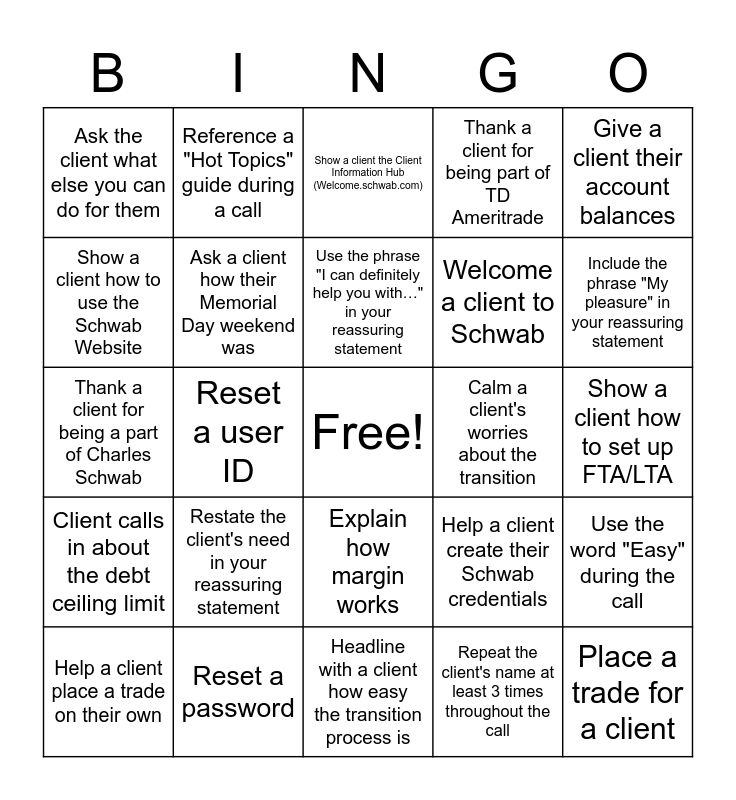 This bingo card has a free space and 27 words: Help a client create their Schwab credentials, A client says "I didn't know that Schwab bought TD Ameritrade", Welcome a client to Schwab, Headline with a client how easy the transition process is, Show a client how to use the Schwab Website, Show a client the Client Information Hub (Welcome.schwab.com), Reference a "Hot Topics" guide during a call, Client calls in about the debt ceiling limit, Calm a client's worries about the transition, Use the word "Easy" during the call, Thank a client for being a part of Charles Schwab, Thank a client for being part of TD Ameritrade, Help a client place a trade on their own, Reset a password, Include the phrase "My pleasure" in your reassuring statement, Ask a client how their day is going, Ask a client how their Memorial Day weekend was, Use the phrase "I can definitely help you with…" in your reassuring statement, Restate the client's need in your reassuring statement, Ask the client what else you can do for them, Show a client how to set up FTA/LTA, Repeat the client's name at least 3 times throughout the call, Reset a user ID, Place a trade for a client, Explain how margin works, Give a client their account balances and Client calls in only for quotes.