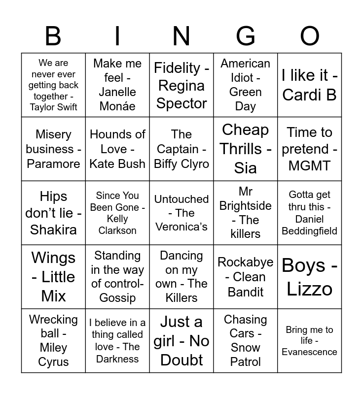 This bingo card has 25 words: Standing in the way of control- Gossip, Just a girl - No Doubt, The Captain - Biffy Clyro, Wrecking ball - Miley Cyrus, I like it - Cardi B, We are never ever getting back together - Taylor Swift, Misery business - Paramore, Make me feel - Janelle Monáe, Mr Brightside - The killers, Dancing on my own - The Killers, Cheap Thrills - Sia, Hips don’t lie - Shakira, Rockabye - Clean Bandit, Boys - Lizzo, Hounds of Love - Kate Bush, Bring me to life - Evanescence, Gotta get thru this - Daniel Beddingfield, Fidelity - Regina Spector, Time to pretend - MGMT, Since You Been Gone - Kelly Clarkson, Untouched - The Veronica’s, I believe in a thing called love - The Darkness, Wings - Little Mix, American Idiot - Green Day and Chasing Cars - Snow Patrol.