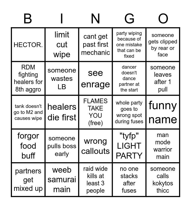This bingo card has a free space and 24 words: partners get mixed up, someone pulls boss early, see enrage, no one stacks after fuses, someone gets clipped by rear or face, HECTOR., limit cut wipe, cant get past first mechanic, whole party goes to wrong spot during fuses, funny name, tank doesn't go to M2 and causes wipe, someone wastes LB, "tyfp" LIGHT PARTY, man mode warrior main, RDM fighting healers for 8th aggro, weeb samurai main, raid wide kills at least 3 people, party wiping because of one mistake that can be fixed, someone leaves after 1 pull, forgor food buff, healers die first, wrong callouts, dancer doesn't dance partner at the start and someone calls kokytos thicc.