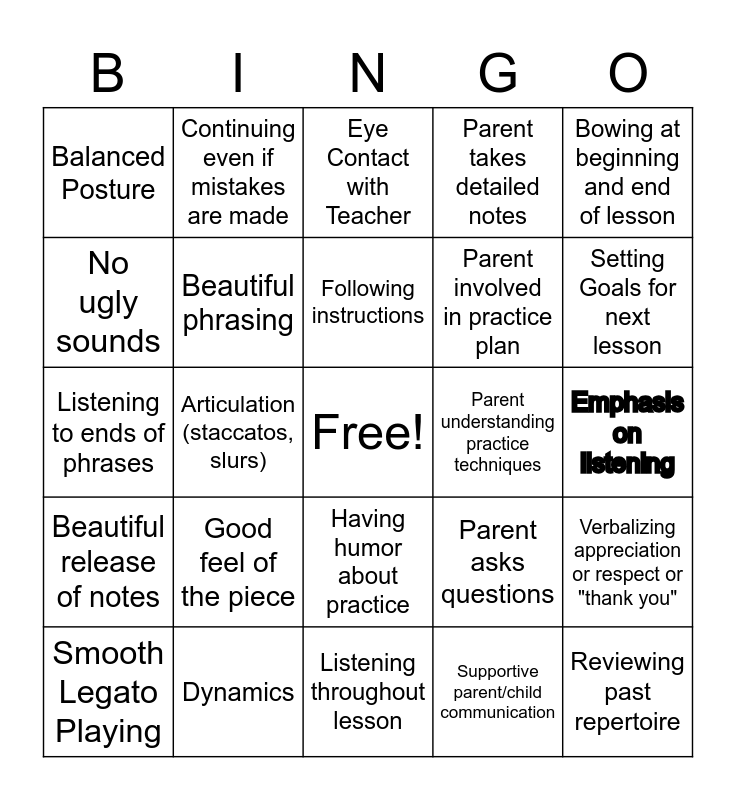 This bingo card has a free space and 29 words: Nice Hand Position, Dynamics, Eye Contact with Teacher, Encouraging words from parent, Bowing at beginning and end of lesson, Balanced Posture, Beautiful phrasing, Following instructions, Parent understanding practice techniques, Verbalizing appreciation or respect or "thank you", Smooth Legato Playing, Articulation (staccatos, slurs), Supportive parent/child communication, Reviewing past repertoire, Listening to ends of phrases, Nice tempo, Listening throughout lesson, Parent asks questions, Setting Goals for next lesson, Beautiful release of notes, Good feel of the piece, Staying calm, Parent involved in practice plan, Emphasis on listening, No ugly sounds, Continuing even if mistakes are made, Having humor about practice, Parent takes detailed notes and Talk about how to practice.