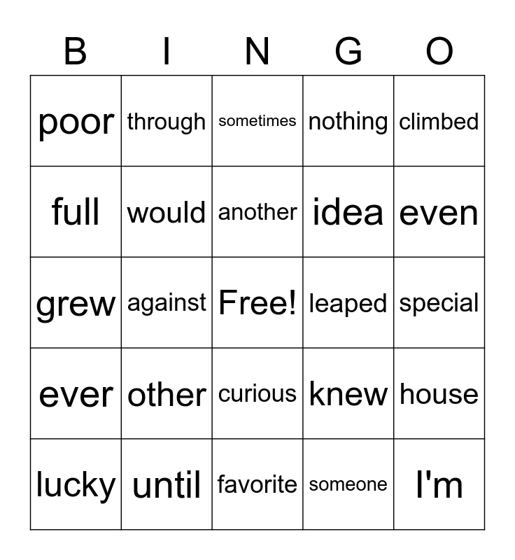 This bingo card has a free space and 24 words: other, until, another, lucky, climbed, poor, full, through, leaped, curious, idea, grew, knew, house, would, someone, special, sometimes, even, against, I'm, ever, nothing and favorite.