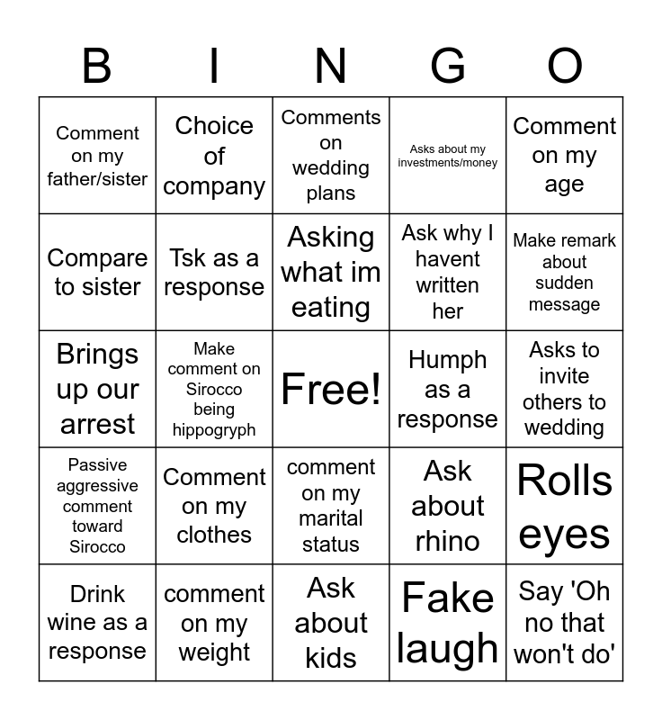 This bingo card has a free space and 24 words: Comment on my clothes, comment on my weight, Asking what im eating, Drink wine as a response, Comment on my age, Comment on my father/sister, Compare to sister, Choice of company, Humph as a response, comment on my marital status, Ask why I havent written her, Brings up our arrest, Ask about rhino, Rolls eyes, Tsk as a response, Fake laugh, Asks to invite others to wedding, Comments on wedding plans, Make remark about sudden message, Make comment on Sirocco being hippogryph, Say 'Oh no that won't do', Passive aggressive comment toward Sirocco, Asks about my investments/money and Ask about kids.