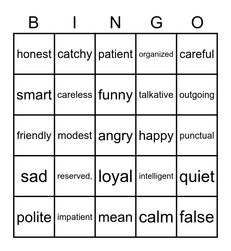 This bingo card has 60 words: rude, impatient, unreliable, sad, calm, lazy, careless, cold, talkative, messy, organized, hard-working, smart, cheerful, bad-humored,, honest, angry, careful, energetic, funny, happy, patient, polite, quiet, reliable, selfish, shy, warm, outgoing, serious, easygoing, aggressive, enthusiastic, bossy, catchy, arrogant, helpful, modest, quiet, friendly, loving, reserved,, punctual, adventurous, intelligent, funny, curious, optimistic, generous, loyal, mean, creative, sociable, open-minded, jealous, confident, good-humored, boring, false and liar.