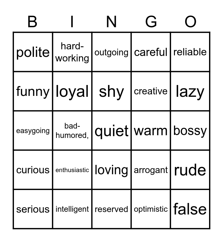 This bingo card has 60 words: angry, intelligent, funny, curious, optimistic, generous, loyal, mean, creative, sociable, careful, energetic, funny, happy, patient, polite, quiet, reliable, selfish, shy, warm, outgoing, serious, rude, impatient, unreliable, sad, calm, lazy, careless, cold, talkative, messy, organized, hard-working, smart, cheerful, bad-humored,, honest, easygoing, aggressive, enthusiastic, bossy, catchy, arrogant, helpful, modest, quiet, friendly, loving, reserved, punctual, adventurous, open-minded, jealous, confident, good-humored, boring, false and liar.
