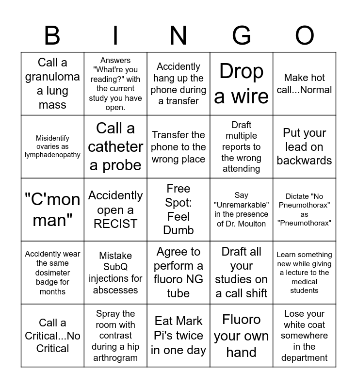 This bingo card has a free space and 24 words: Mistake SubQ injections for abscesses, Spray the room with contrast during a hip arthrogram, Transfer the phone to the wrong place, Call a Critical...No Critical, Make hot call...Normal, Call a granuloma a lung mass, Misidentify ovaries as lymphadenopathy, Answers "What're you reading?" with the current study you have open., Say "Unremarkable" in the presence of Dr. Moulton, Agree to perform a fluoro NG tube, Draft multiple reports to the wrong attending, "C'mon man", Draft all your studies on a call shift, Learn something new while giving a lecture to the medical students, Call a catheter a probe, Fluoro your own hand, Dictate "No Pneumothorax" as "Pneumothorax", Accidently hang up the phone during a transfer, Put your lead on backwards, Accidently open a RECIST, Lose your white coat somewhere in the department, Accidently wear the same dosimeter badge for months, Drop a wire and Eat Mark Pi's twice in one day.