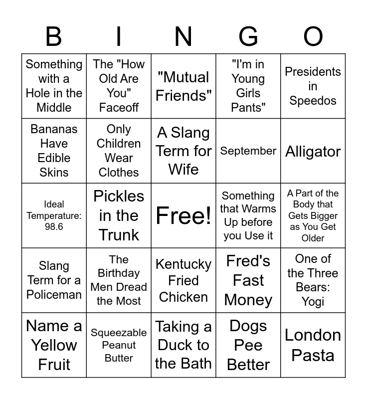This bingo card has a free space and 27 words: Fred's Fast Money, Cowboy's Leather Purse, September, Taking a Duck to the Bath, Bananas Have Edible Skins, "Mutual Friends", The "How Old Are You" Faceoff, Slang Term for a Policeman, Something that Warms Up before you Use it, One of the Three Bears: Yogi, Ideal Temperature: 98.6, "I'm in Young Girls Pants", Name a Yellow Fruit, Squeezable Peanut Butter, Alligator, Something Men Wear to Bed, Only Children Wear Clothes, A Slang Term for Wife, The Birthday Men Dread the Most, Something with a Hole in the Middle, A Part of the Body that Gets Bigger as You Get Older, Dogs Pee Better, Pickles in the Trunk, London Pasta, Kentucky Fried Chicken, Presidents in Speedos and Better than Being Rich.