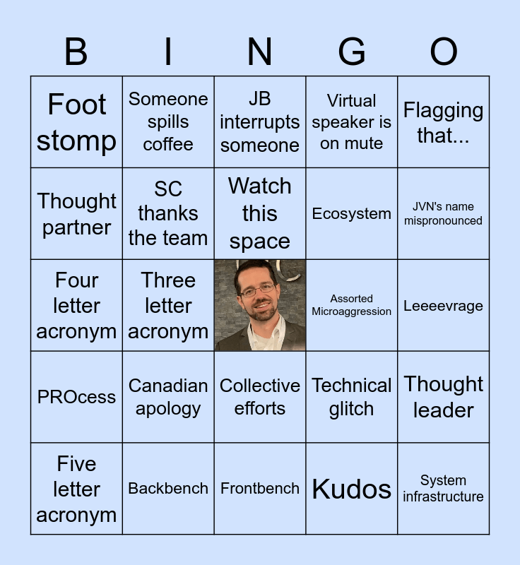 This bingo card has a free space and 24 words: Canadian apology, Backbench, Watch this space, Five letter acronym, Flagging that..., Foot stomp, Thought partner, Someone spills coffee, Assorted Microaggression, Collective efforts, Ecosystem, Four letter acronym, Technical glitch, Thought leader, SC thanks the team, Kudos, Leeeevrage, JB interrupts someone, JVN's name mispronounced, Three letter acronym, System infrastructure, PROcess, Virtual speaker is on mute and Frontbench.