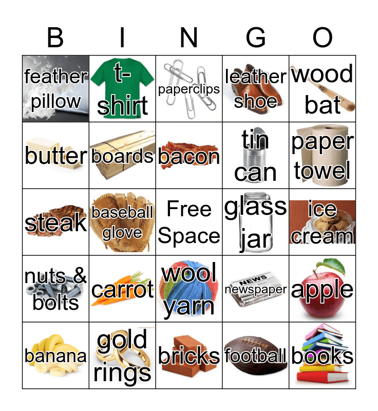 This bingo card has 24 images, a free space and 24 words: carrot, gold rings, bacon, banana, wood bat, feather pillow, butter, t-shirt, glass jar, wool yarn, tin can, steak, newspaper, apple, boards, football, ice cream, paperclips, paper towel, baseball glove, books, nuts & bolts, leather shoe and bricks.