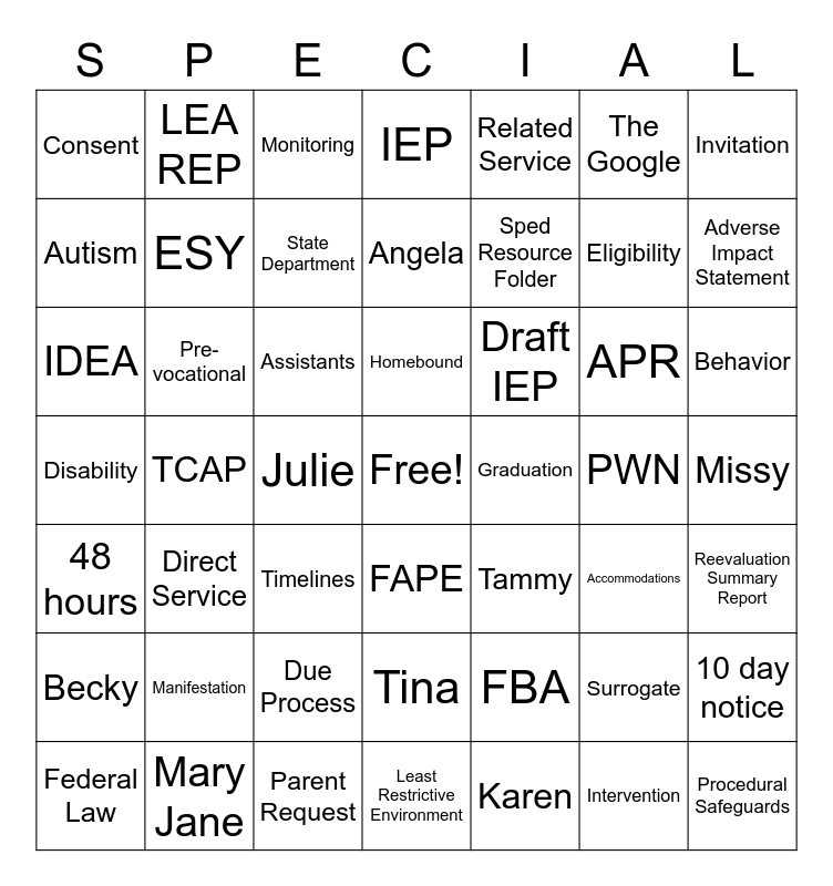 This bingo card has a free space and 66 words: 60 days, 48 hours, Hawkins County Schools, APR, Graduation, Gen Ed Teacher, LEA REP, OHI, Autism, Parent Request, Homebound, Surrogate, IDEA, Related Service, Confidentiality, The Google, Sped Resource Folder, Consent, Continuum, ESY, Assistants, Pre-vocational, IEP, Timelines, Evaluation, Reevaluation Summary Report, Tammy, Carole, Eligibility, Manifestation, Behavior, FBA, BIP, Eligible, Draft IEP, Disability, 10 day notice, Angela, Julie, Becky, Invitation, PWN, Adverse Impact Statement, Measurable Annual Goals, Least Restrictive Environment, FAPE, State Department, Federal Law, Procedural Safeguards, Missy, Karen, OT, PT, Transportation, Transition, Direct Service, Jo, Tina, Monitoring, TCAP, Accommodations, Consultation, Intervention, Mary Jane, Due Process and LD.