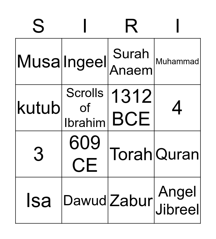 This bingo card has a free space and 15 words: Isa, Angel Jibreel, Surah Anaem, Musa, 4, kutub, 609 CE, Zabur, Scrolls of Ibrahim, 3, Quran, Muhammad, 1312 BCE, Ingeel and Dawud.