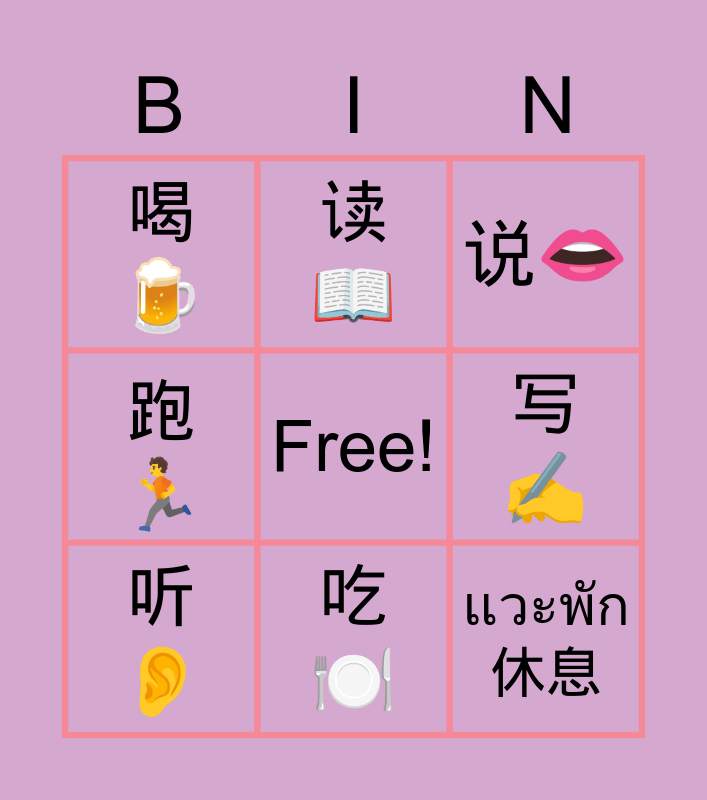 This bingo card has a free space and 8 words: 跑 🏃, 读 📖, 写 ✍️, 听 👂, 说👄, 喝 🍺, 吃 🍽️ and แวะพัก 休息.
