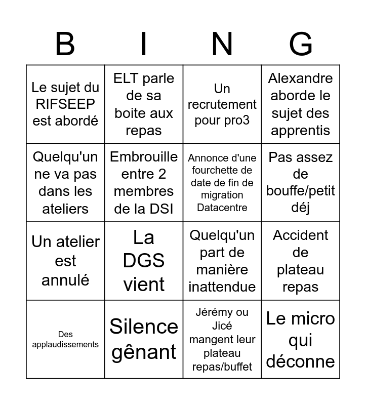 This bingo card has 16 words: Silence gênant, Accident de plateau repas, Un recrutement pour pro3, Le sujet du RIFSEEP est abordé, Un atelier est annulé, ELT parle de sa boite aux repas, Quelqu'un part de manière inattendue, Jérémy ou Jicé mangent leur plateau repas/buffet, Quelqu'un ne va pas dans les ateliers, Embrouille entre 2 membres de la DSI, Des applaudissements, Alexandre aborde le sujet des apprentis, La DGS vient, Pas assez de bouffe/petit déj, Annonce d'une fourchette de date de fin de migration Datacentre and Le micro qui déconne.