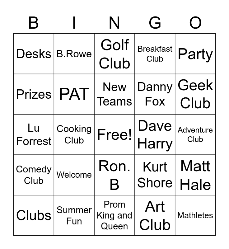 This bingo card has a free space and 24 words: Welcome, Summer Fun, New Teams, Clubs, Party, Desks, Prizes, B.Rowe, Dave Harry, Ron. B, Danny Fox, Lu Forrest, Kurt Shore, Matt Hale, PAT, Art Club, Adventure Club, Golf Club, Geek Club, Cooking Club, Mathletes, Comedy Club, Breakfast Club and Prom King and Queen.
