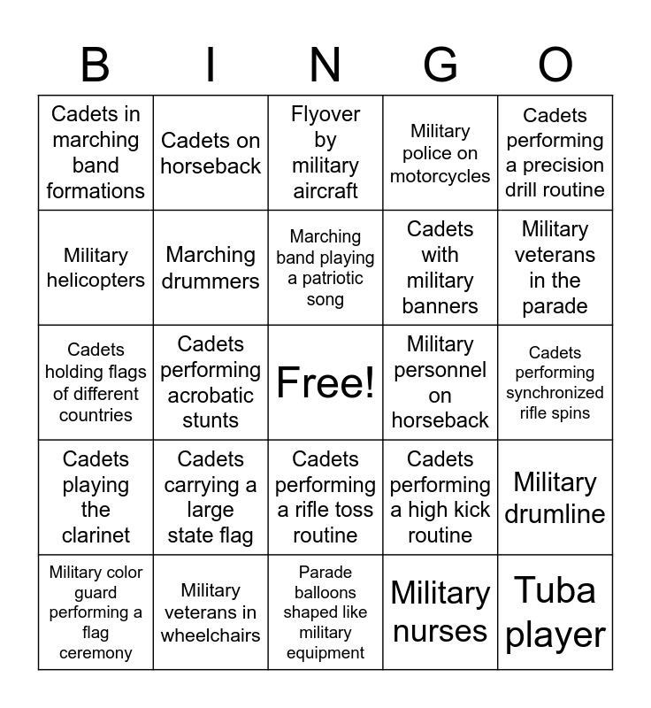 This bingo card has a free space and 75 words: adets marching in formation, American flag, Flyover by military aircraft, Bagpipes, Drumline, Band playing "The Star-Spangled Banner", Color guard, Cadets in dress uniform, Military vehicles, Falcon mascot, Cadets performing rifle drills, Parade commander giving orders, Marching band playing a patriotic song, Military helicopters, Flyover by fighter jets, Cadets performing acrobatic stunts, Cadets carrying flags of different states, Tuba player, Parade float representing a military branch, Cadets performing a precision drill routine, Military honor guard, Cadets holding flags of different countries, Marching drummers, Cadets on horseback, Military police on motorcycles, Cadets performing a formation change, Colorful banners and flags, Trumpet player, Military chaplains, Cadets saluting during a tribute, Military dogs and their handlers, Cadets carrying the POW/MIA flag, Military cannons firing salutes, Cadets performing a high kick routine, Military veterans in the parade, Cadets with military banners, Bugle player, Military jeeps, Cadets performing synchronized rifle spins, Military nurses, Cadets holding signs with motivational messages, Parade marshal in a convertible car, Cadets performing a sword drill, Military brass band, Cadets playing the bagpipes, Cadets carrying a large American flag, Military color guard performing a flag ceremony, Cadets in marching band formations, Parade announcer providing commentary, Cadets performing a flag folding ceremony, Military vehicles towing cannons, Cadets performing a rifle toss routine, Marching drum major, Military Humvees, Cadets with banners representing different military units, Military veterans riding in a float, Cadets playing the trombone, Military cadets in training uniforms, Cadets performing a flag raising ceremony, Military bagpipers, Cadets carrying a large state flag, Military color guard performing a rifle volley, Cadets performing a precision marching routine, Military motorcycles, Cadets playing the saxophone, Military personnel on horseback, Cadets with flags representing different branches of the military, Military artillery guns, Cadets performing a sword arch, Military drumline, Cadets playing the clarinet, Military veterans in wheelchairs, Cadets with flags representing different military academies, Parade balloons shaped like military equipment and Cadets performing a formation flyover.