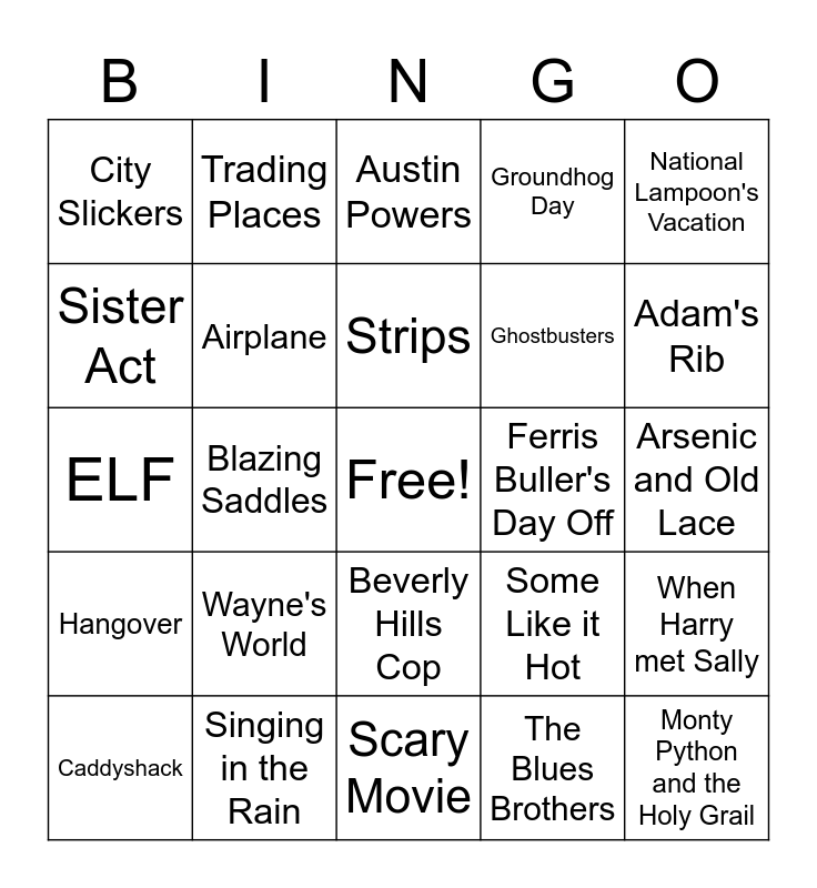 This bingo card has a free space and 24 words: Wayne's World, Singing in the Rain, Strips, Caddyshack, National Lampoon's Vacation, City Slickers, Sister Act, Trading Places, Ferris Buller's Day Off, Beverly Hills Cop, Ghostbusters, ELF, Some Like it Hot, When Harry met Sally, Airplane, The Blues Brothers, Arsenic and Old Lace, Austin Powers, Adam's Rib, Blazing Saddles, Monty Python and the Holy Grail, Hangover, Groundhog Day and Scary Movie.