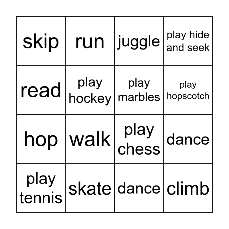 This bingo card has 20 words: dance, draw, juggle, play football, play tennis, read, skate, skip, hop, run, walk, play chess, play hockey, climb, play marbles, play tag, play hopscotch, play hide and seek, dance and dance.