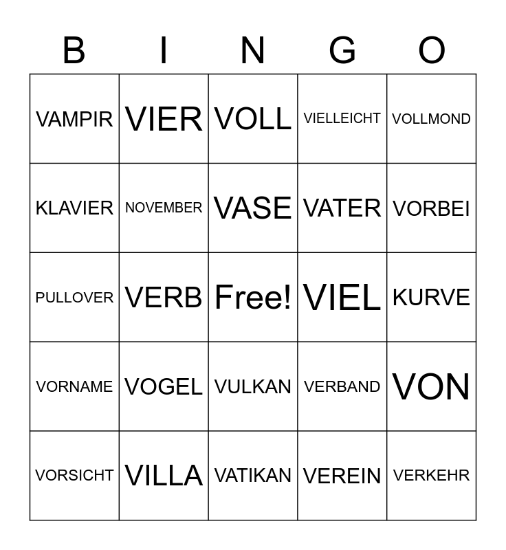 This bingo card has a free space and 24 words: VOGEL, VILLA, VASE, VORSICHT, VOLLMOND, VAMPIR, KLAVIER, VIER, VIEL, VULKAN, VATER, PULLOVER, VERBAND, VON, NOVEMBER, VEREIN, KURVE, VOLL, VORBEI, VERB, VERKEHR, VORNAME, VIELLEICHT and VATIKAN.