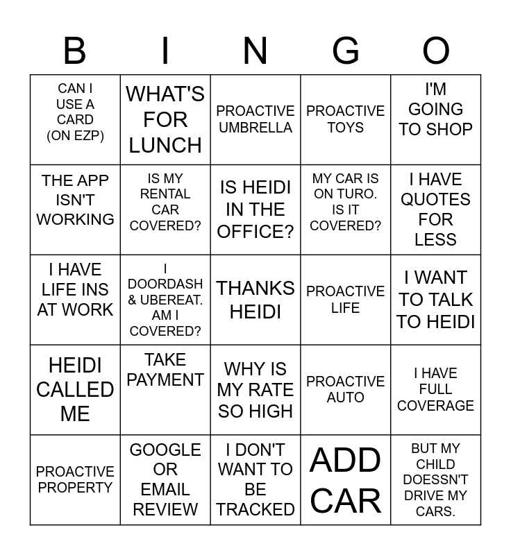 This bingo card has a free space and 24 words: TAKE PAYMENT, GOOGLE OR EMAIL REVIEW, IS HEIDI IN THE OFFICE?, PROACTIVE PROPERTY, I'M GOING TO SHOP, CAN I USE A CARD (ON EZP), THE APP ISN'T WORKING, WHAT'S FOR LUNCH, PROACTIVE LIFE, WHY IS MY RATE SO HIGH, MY CAR IS ON TURO. IS IT COVERED?, I HAVE LIFE INS AT WORK, PROACTIVE AUTO, I HAVE FULL COVERAGE, IS MY RENTAL CAR COVERED?, ADD CAR, I WANT TO TALK TO HEIDI, PROACTIVE UMBRELLA, I HAVE QUOTES FOR LESS, I DOORDASH & UBEREAT. AM I COVERED?, BUT MY CHILD DOESSN'T DRIVE MY CARS., HEIDI CALLED ME, PROACTIVE TOYS and I DON'T WANT TO BE TRACKED.