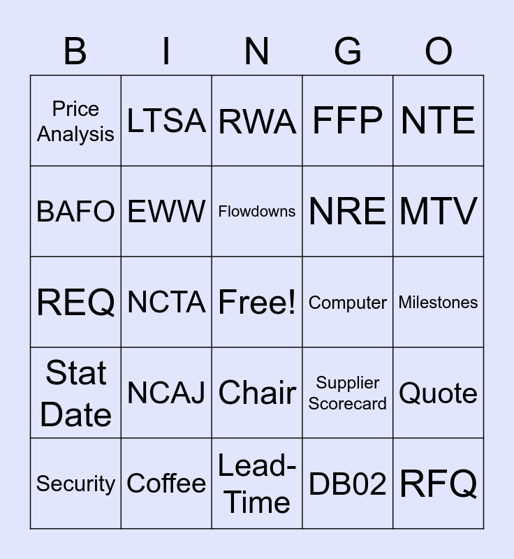 This bingo card has a free space and 50 words: SCPS, RFQ, Payment Terms, Lead-Time, NCAJ, FAI, LTSA, M903, BAFO, Charge Number, EWW, FFP, Quote, Supplier Scorecard, DPAS, Sole Source, Flowdowns, Computer, Competitive, NTE, NCTA, DB02, Price Analysis, NRE, PO Number, Vendor Number, MTV, OA, RWA, Chair, Classified, COTS, Change Notice, Engineering, Coffee, UCA, VOSB, PACE, Buyer, Milestones, SCAR, PCAR, WOSB, Minco, Security, REQ, PLM, SIM-to, Stat Date and F/R.